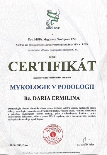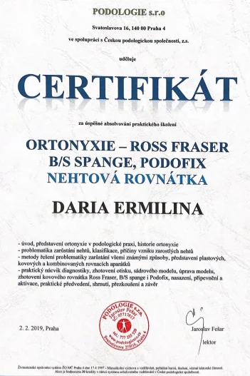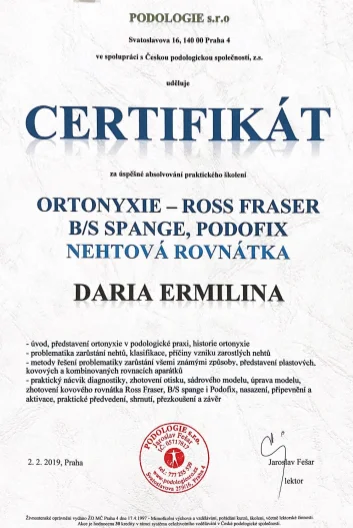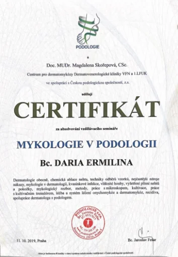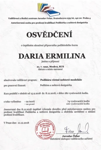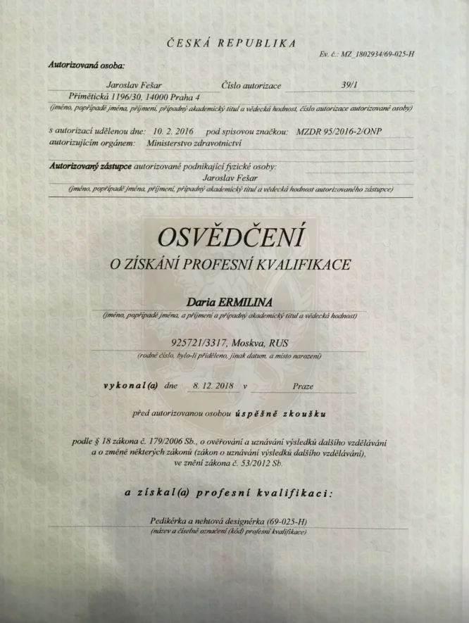 Jmenuji se Darja a v oblasti podologie pracuji více než 8 let. Absolvovala jsem odborné vzdělání v Česku, Německu a Rusku. Můj přístup — jemná ruční práce bez bolesti a agresivních metod. Pečuji o zdraví nohou dětí, dospělých, seniorů, lidí s cukrovkou i sportovců. Specializuji se na složité případy včetně diabetické nohy a neuropatie.